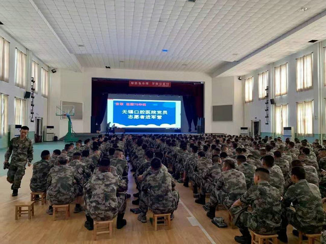 在建军92周年来临之际,无锡口腔医院党员志愿者一行在党支部副书记副院长桂湧的带领下于7月26日上午专程来到无锡炮兵第七十二旅开展拥军活动,此次活动受到无锡市军分区宣传科汤主任,炮兵第七十二旅汪副主任等领导的热情接待,口腔专家们为部队官兵带来口腔健康知识讲座,并给官兵进行口腔健康检查。